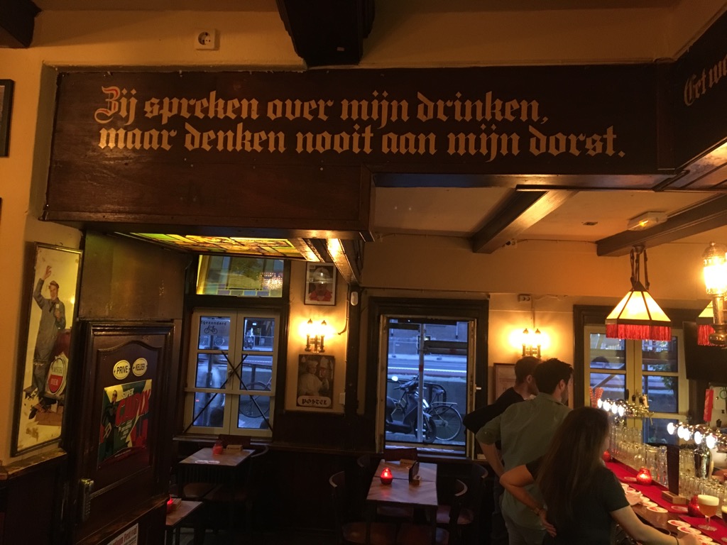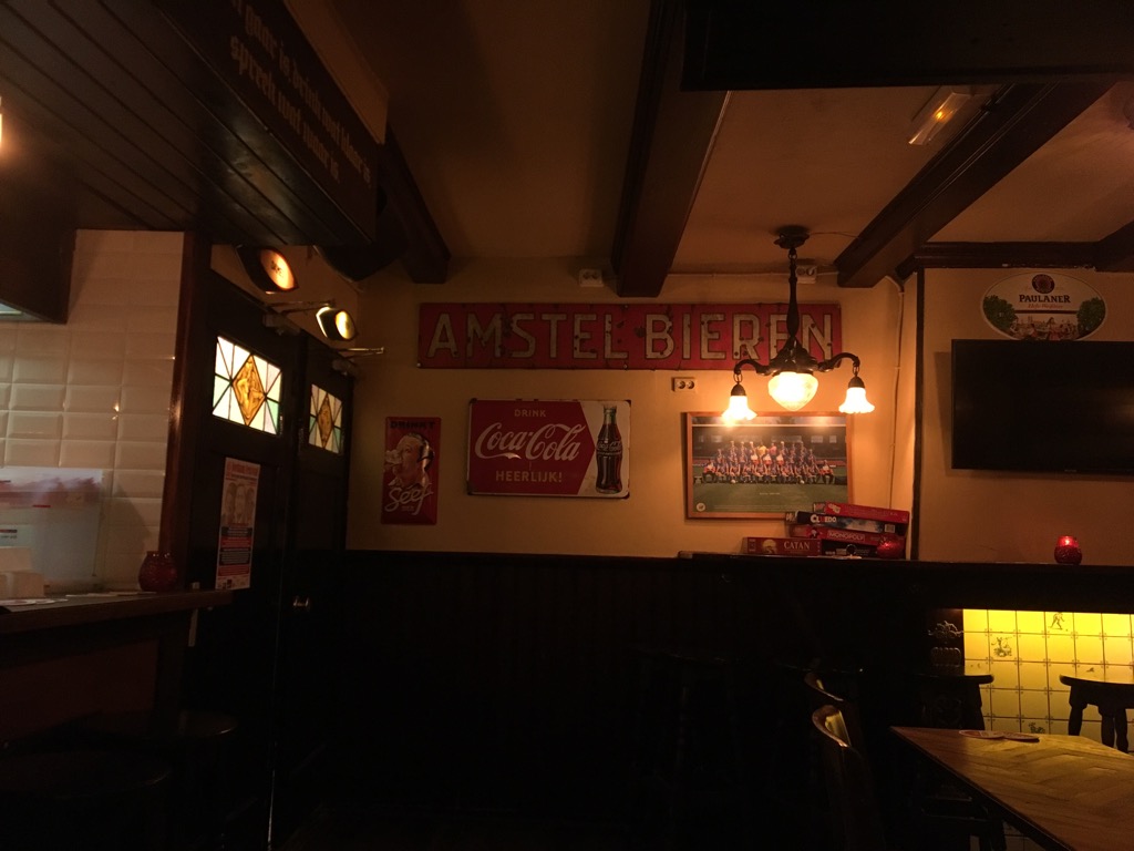 This establishment was taken-over three months prior to our trip and speaking to the barman not much has changed apart from a little tidying up. Our experience here was very much made by the bar tender who told us the way locals drink (a shot of Genever with a small beer, 25cl), he gave us all a taster and told us the history of the bar (and his experience as a barman). Very much a locals’ pub – which we revisited.